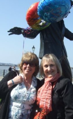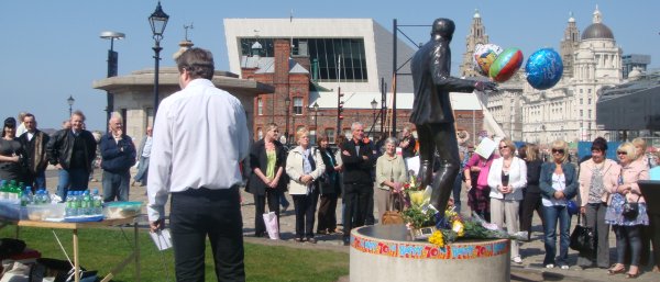 In Liverpool on Saturday the sun was shining and well over a hundred people gathered at the statue. With Billy's voice in the air and the arrival of Jean it was an amazing day. The statue was covered in cards, balloons and flowers, a truly awesome thing to see. Unfortunately Albie couldn't be there but he was remembered by everyone who also send him their very best wishes. Radio Merseyside's Frankie Conner arrived and said he had just finished his show and played many Billy songs and also paid tribute to another legend - Eddie Cochran, whose tragic death was remembered 50 years on. Frankie also said he did a live interview on air with Albie on the phone and after the show commented on nearly 60 emails from all over the world had arrived to wish Albie and Jean all the best. We all gathered in the Maritime Museum for entertainment, refreshments and talk of our memories of Billy. The Billy Fury In Thoughts Of You an club had their memorabilia stall set up with some fantastic 70th birthday T-shirts designed by Vic. Well done mate on a superb job. A special thanks to Mags and Margaret and an extra special thanks to Jenny for arranging the whole day, with many problems on the way, with let's say plenty of chiefs and not enough indians at the museum. Rules and regulations were coming out of the walls, so well done Jenny and the hard task you pulled off perfectly. Jean spoke to everyone and thanked them for being there and sang a moving In Thoughts Of You. Excellent.I The raffle was held for Jean's special charity Nobody's Child.