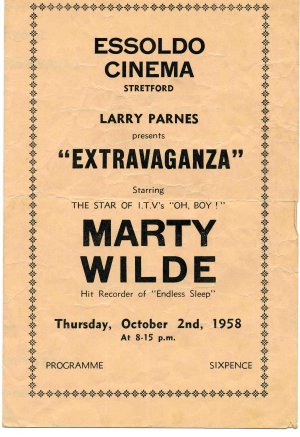 Two thousand screaming teenagers held up the programme at Larry Parnes' "Extravaganza" - which featured rock 'n' roll idol Marty Wilde - last Wednesday when an 18-years-old Dingle boy, Ronnie Wycherley, of 35 Haliburton Street, completed a three-minute spot in the star-studded programme.Ex-tugman Ronnie, with a little apprehension, took the stage at the Essoldo Theatre, Birkenhead, after the compere of the show said: "Larry Parnes has given breaks to young people in his time and tonight he has invited a young local boy to entertain you." Wearing a two-tone Texan jacket and a guitar slung over his shoulder, Ronnie nervously walked on to the stage, and swung straight into the first number with an Elvis Presley inspired style. His three minutes were constantly punctuated by screams and shouts from hundreds of teenage girls, which were intensified at the least move of his body. Larry Parnes - manager of Marty Wilde, Tommy Steele and other top-line entertainers - came from the theatre dressing rooms and sat on the end of the eighth row smiling broadly as he chewed his cigar, weighing up the possibilities. Afterwards in the dressing room, Ronnie sat on the corner an arm chair and told the Weekly News: "I was nervous, but it's only natural." How did Ronnie get into the act? "I sent a tape to Larry Parnes a few weeks ago," he explained, "and I was asked to come here tonight." Sure enough Ronnie went to the "Extravaganza" show on Wednesday evening and the first question Larry Parnes put to him was: "Have you got guts?" Within 30 minutes, Ronnie stood against the gold-coloured curtains of the theatre to make his first big public appearance. Last year he entered for the ODVA talent competition at Bootle but was not placed. He composes his own music and has written 25 rock 'n' roll tunes within two years. He is a former pupil of Wellington Road Secondary Modern School, Dingle. "What happens now depends on Larry Parnes," said Ronnie. Also taking part in the show was 18-years-old Jimmy Tarbuck of 76 Queens Drive, Mossley Hill, who is gradually making a name for himself in different parts of the country. On Wednesday evening Jimmy substituted for Pat Laurence, at present suffering froma throat infection. By choice he is a rock 'n'roller and has had one long-player released. However, since he won first prize at a Butlins talent contest - as a comedian - Jimmy is busy writing scripts for his next public appaearance on the Pavilion in the near future.- Liverpool Weekly News, October 1958. (First reproduced by the Sound Of Fury fan club magazine.) <<Back to biography |