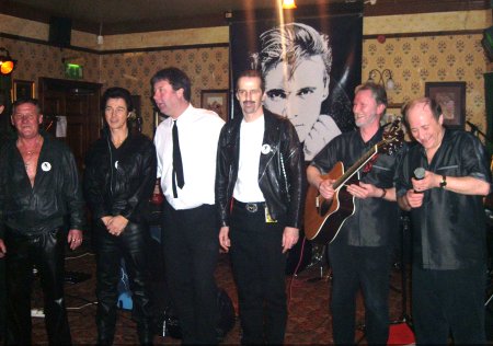 Kevin Summerfield, Laura’s manager then asked Harry to come forward for a presentation of an original painting of Billy by Dave Whateley, presented by Sophie and Cathy who had made the collection suggested by DR for all the time and effort that Harry puts into this fabulous website. This brought huge applause from the audience, well deserved Harry, thank you so very much. Maureen, Harry’s wife was presented with a bouquet for all her patience in allowing Harry to dedicate so much time to all our benefit. Harry said that the site started almost seven years with a couple of pages and had somehow grown to be the site that it now is. He mentioned that there wasn’t a nasty person amongst all the folk who frequent the site and this was received with cheers. Laura continued her fine set with ‘I Love How You Love Me’, ‘Let Me Go Lover’, and he raunchy ‘I’m So Blue(over you)’. Next was the ‘Sunnyside Girls Choir’, all the ladies from the message board joined hands and stood in a semi-circle around Laura to sing ‘Legends Never Die’. Sophie joined Laura at the microphone and sang like a little trooper, fabulous! There were more thanks from Harry and then Rob Dee and The Fury Sound were announced to the ‘Juke Box Jury’ tune played by the band. As Rob made his entrance in a white jacket black shirt, white tie and black leather trousers to do his all Billy Fury Set.
